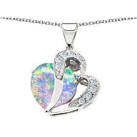925 Sterling Silver 14K White Gold Plated Lab Created Heart Shape Opal Pendant crafted in 14k White Gold Plated Silver 1 Stone 10.00 Carats 12mm Heart Shape Color: White iridescent Clarity: Clean, 9 Stones 0.25 Carats round white topaz Color: Colorless Clarity: Clean Free 18 inches gold chain included - FREE LIFETIME WARRANTY, GIFT BAG AND GIFT CARD!. Our Style Number 27378
