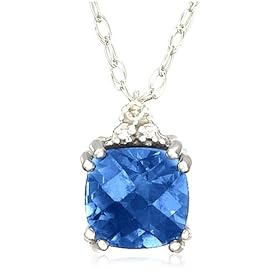 This dainty September birthstone pendant captures attention with a vibrant blue created Ceylon sapphire stone. The checkerboard cushion-cut stone is held in a prong setting of 10 karat gold and accented at the top with a small triangle made up of rhodium beads and a genuine diamond accent (.005 ct). This elegant piece is presented on a delicate 18-inch rope chain. Choose between white or yellow gold.