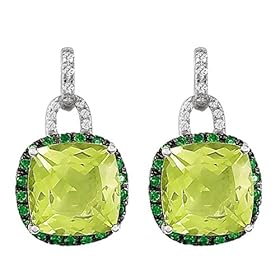 Lush and verdant, these gemstone earrings are full of luxuriant beauty. Each lemon quartz gem is framed by a host of glowing green garnets set in 14 karat white gold. Diamond-studded loops suspend the gemstones for a dramatic, dangling effect. Matching ring also available.