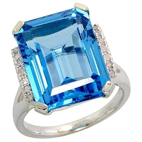 14k White Gold Large Stone Ring, w/ 0.10 Carat Brilliant Cut Diamonds & 11.43 Carats 16x12mm Emerald Cut Blue Topaz Stone, 5/8" (16mm) wide