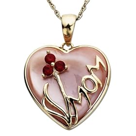 Show your affection with this dainty heart-shaped pendant, made from pink mother-of-pearl encased in polished 14 karat yellow gold. Overlaying the mother-of-pearl is the word "Mom" and a simple gold flower stem topped with three red rubies. Small, feminine, and classy, this is a piece she can wear proudly everyday. The pendant is suspended from an 18-inch light rope chain, also in 14 karat yellow gold. Enjoy it with the chain provided, or add a different gold chain of your choice.