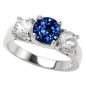 925 Sterling Silver 14K White Gold Plated Lab Created Round Sapphire Engagement Ring crafted in 14k White Gold Plated Silver 1 Stone 1.35 Carats 7mm round Color: Blue Clarity: Clean, 2 Stones 1.00 Carats round white topaz Color: Colorless Clarity: Clean - FREE LIFETIME WARRANTY, GIFT BAG AND GIFT CARD!. Our Style Number 27069