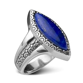 Prized for its rich color, lapis is believed to open the heart to love and beauty. You'll find it easy to love this beautiful lapis ring, especially if blue is "your" color...and who doesn't love blue? Beautiful, natural lapis is showcased in an intricately stamped sterling silver pattern which encircles the marquis-shaped cabochon. Modeled on a traditional Native American silver work technique that requires time and precision, the shank is tapered for a comfy fit and measures ¼" long x ¼" wide. Indulge your passion for the "blues" with this beautiful ring that reflects the color of the Southwest sky. Made in New Mexico, USA.