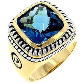 This Faceted Blue Topaz Designer Ring features two tones of 14k gold and white gold rhodium bonding. It features Bezel Set Blue Topaz Cushion Cut CZ and cable style accents bordering it in Goldtone and Silvertone. Its blue topaz CZ centerpiece is quite radiant with captivating color . Excellent quality too! Flashing designer Style jewelry was never so affordable. At our wholesale prices this piece is a steal.