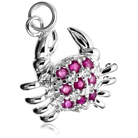 Nine sparkling round rubies are set into textured sterling silver to form the shell of this beautiful crab charm. The charm is made from fine quality sterling silver, with matte and polished finishes, and it has a realistic, detailed design that includes a domed shell and curved legs and claws. The interior of the charm is hollowed, allowing light to filter through the stones. The rubies featured here have a deep pink-red color and a faceted cut for a beautiful shimmer. The charm dangles from a split ring that allows it to attach easily to a bracelet, pendant, or pin.