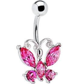 Butterfly belly ring featuring brilliant gems on a universal 3/8" curved barbell. Add Bodycandy body jewelry at wholesale prices to your collection today! Specifications: 14 Gauge (1.6 mm), 3/8" Length (10 mm), 316L Surgical Grade Stainless Steel, 5mm top ball --Belly button navel ring body jewelry