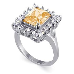 Features Sparkling high quality Emerald Cut Champagne Simulated Diamond Cubic Zirconia in the center with several small clear Simulated CZ's accents makes this a stylish Ring.