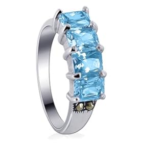 Sterling Silver Ring Marcasite accents Band with Four Emerald cut Aquamarine Cubic Zirconia Stones in Prong settings.