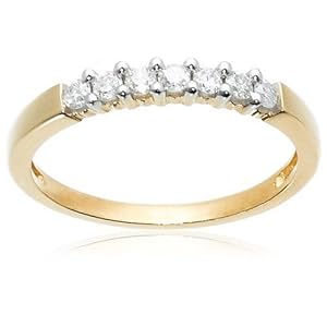 Seven round diamonds lend their beautiful sparkle to this simply designed ring, made from 10 karat gold. The diamonds have a total weight of 1/4 carat and are held securely in shared prong settings. They are near colorless, with a color grading of H-I, and they have a very good cut and a minimum clarity of I3. A sleek polished gold band with squared edges completes the design. This ring is available in your choice of white or yellow gold and can be resized up or down by 1/2 size.